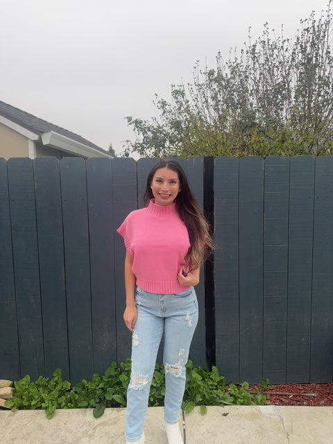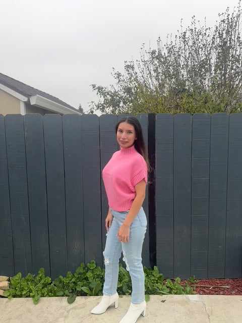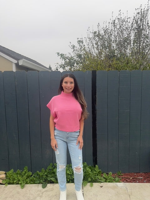 This pink Short Sleeve Mock Neck Sweater brings a fun twist to your wardrobe with its cozy yet light feel. Perfect for layering or wearing solo, it adds a pop of cheerful color and a touch of flair to any outfit. Stay comfy and cute all day long and pair it with 80's Baby Mom Jeans to finish the look!